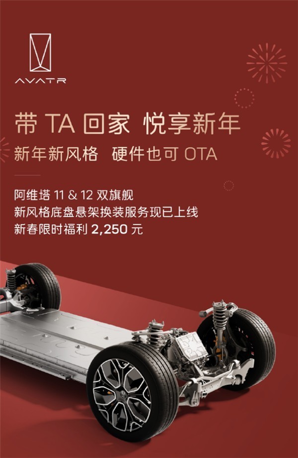 近日,阿维塔汽车官方宣布推出一项针对阿维塔 11 和 12 车型的底盘悬架换装服务。该项服务原价 4500 元,现推出新春限时优惠活动,优惠价仅为 2250 元,优惠截止日期为 2 月 27 日。
